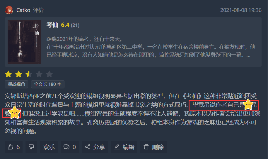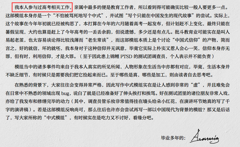 我之前在B站看Anastasia老师主持的《大奥之蝶》replay时,无意间注意到Anastasia老师在公开自我介绍里提及了自己正在从事的职业(为了不造成二次传播伤害,我在文末附上链接,需要证明的话我可以截图)。因为很尊敬作者的职业,所以对这件事留有印象。后来得知作者准备创作以高考为主题的模组,我想到之前看到过作者自我介绍中的职业,对此很感兴趣并阅读了后续发布的《考仙》模组。作者在《考仙》后记中也提到自己从事过相关工作,因此我误以为作者不介意提及职业相关信息,在dicecho进行评价时提及了这一在其他平台公开的信息,可能对作者造成了困扰,在这里十分抱歉。