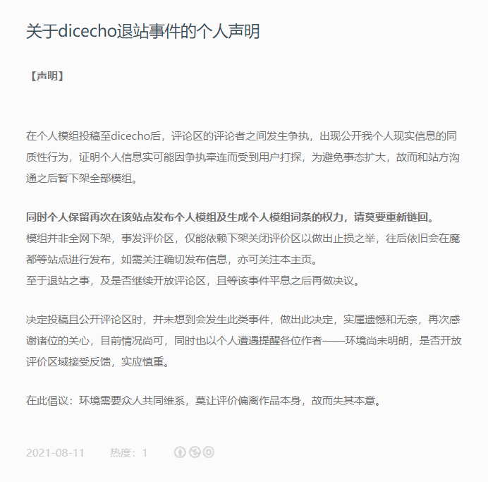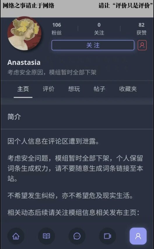 但是无论如何,我还是给作者添了麻烦,我感到非常遗憾并再次道歉,希望能够尽量不影响到Anastasia老师的创作热情,期待您后续的模组。同时也向由于我的不谨慎被打扰的dicecho站长道歉,今后在撰写模组评价时我会更加谨慎,避免类似的事情再次发生。