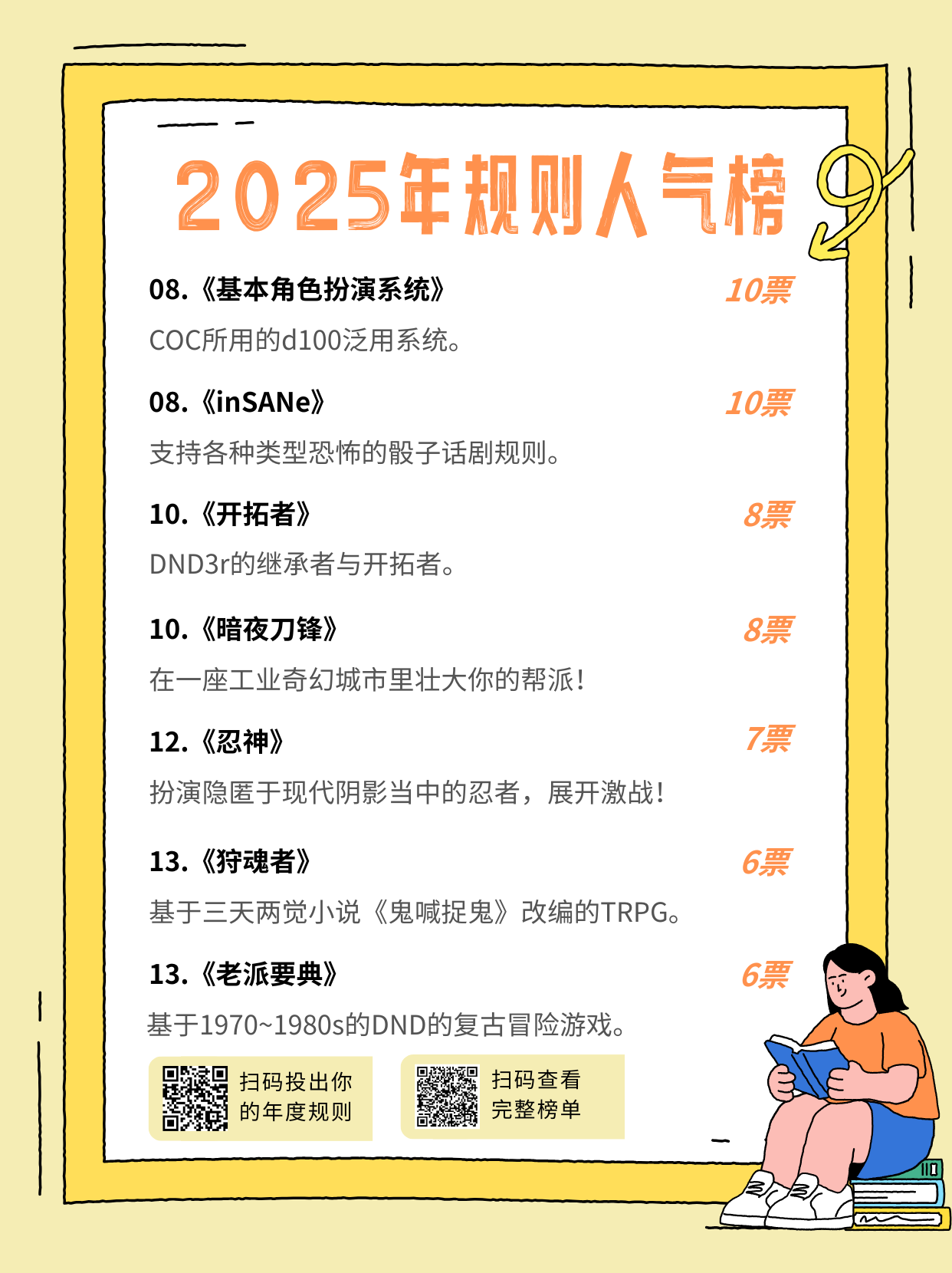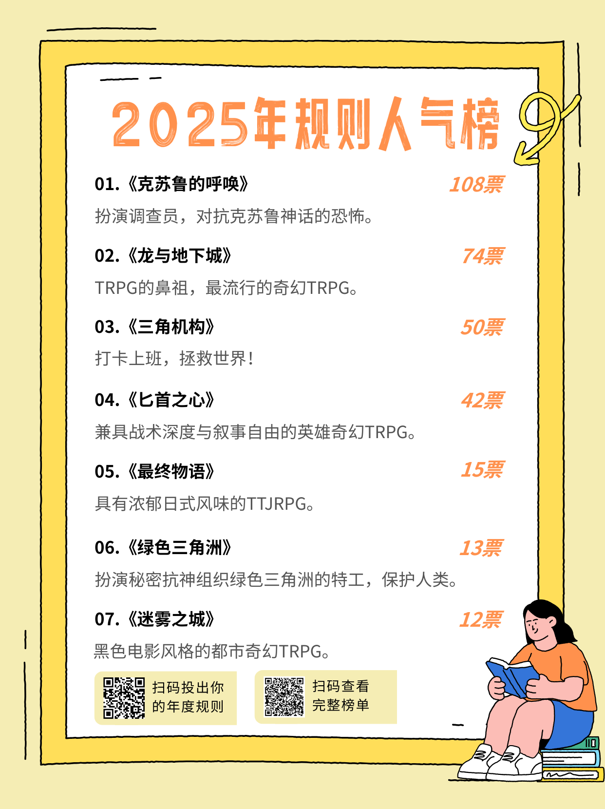 进行这个统计的本意是想要观察与记录一下国内跑团规则与模组的流行趋势,这次规则部分的榜单上也出现了在去年才热度激增的两款规则——《三角机构》和《匕首之心》,如果有人能够因为这个契机了解到感兴趣的规则和模组的话就太好了。